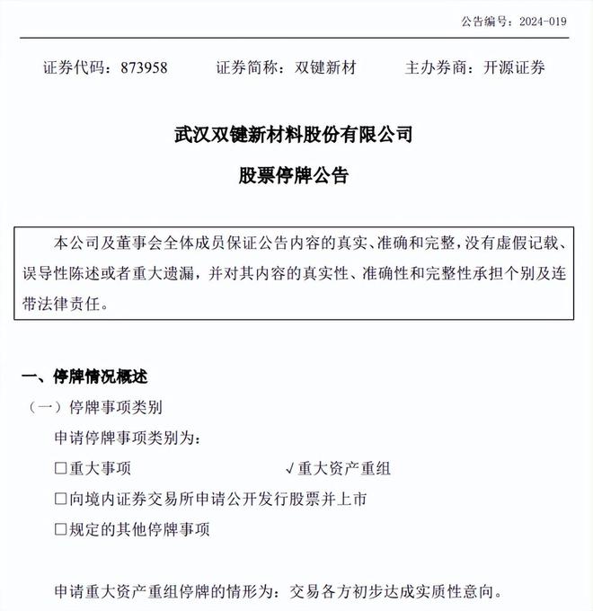 此次收购实际上早有预兆。8月5日,双键新材向全国中小企业股份转让系统有限责任公司递交停牌申请,其申请停牌事项类别为重大资产重组。双键新材股票自8月6日起停牌,原定于9月6日复牌,后又申请延期至9月30日。